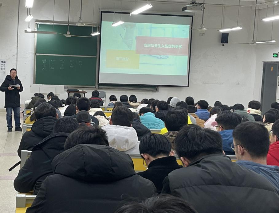 2021年12月31日下午,热博rb88唯一官方网站征兵政策宣讲会在明理105召开。学院毕业班辅导员及2022届毕业生代表近200人参加了会议,会议由院党委副书记张向林主持。